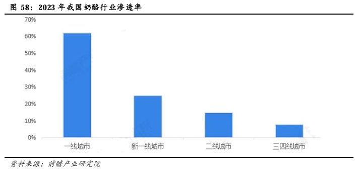 从消费渗透率来看,一线城市渗透率较高,低线城市提升空间大。其中,一线城市的渗透率高于60%,而三四线城市渗透率不足10%。