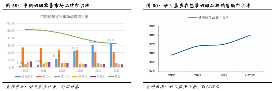 我国奶酪行业集中度持续提升。据欧睿数据,2017-2022年,在奶酪零售市场中,前五大品牌合计市场占有率持续增长至67.7%。其中,妙可蓝多依托产品、品牌、渠道方面的核心竞争力以及研发和供应链优势,于2021年完成超越成为行业第一,并于2022年将市占率提升至32.7%。根据Worldpanel消费者指数,在2025年上半年中国包装奶酪品牌销售额中,妙可蓝多奶酪市场占有率超过38%,奶酪棒市场占有率持续增长,稳居行业第一。另根据Euromonitor统计,中国奶酪零售市场品牌市场占有率中,2025年上半年妙可蓝多持续保持第一。