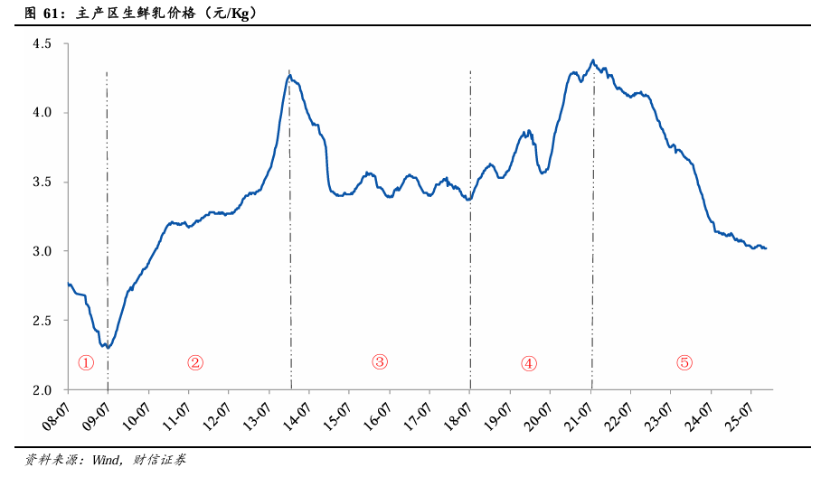 4) 原奶价格开始底部盘整。主产区生鲜乳价格在3.02-3.05区间已经盘整接近半年时间。