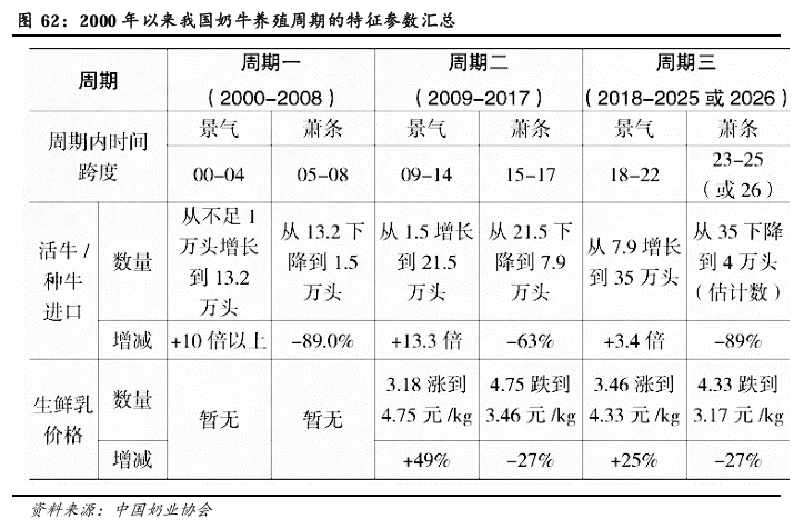 具体到国内供给的周期来看,2000年以来大致经历了3个周期,每个周期的平均时间跨度长达8~9年,每个周期可划分为4~5年“景气” 3~4年“萧条(或调整)”两个阶段,周期的拐点允许1年的时间容错。周期性波动最典型的特征参数就是进口种用牛的周期性变化(反映扩建产能的积极性)、生鲜乳价格的波动(反映养殖效益变化)等。