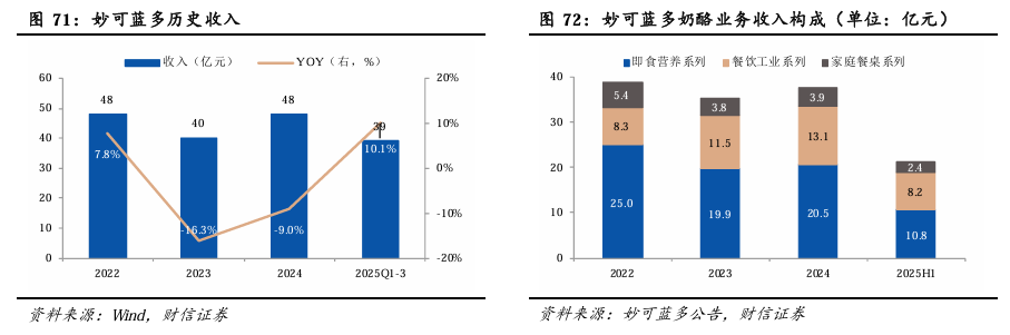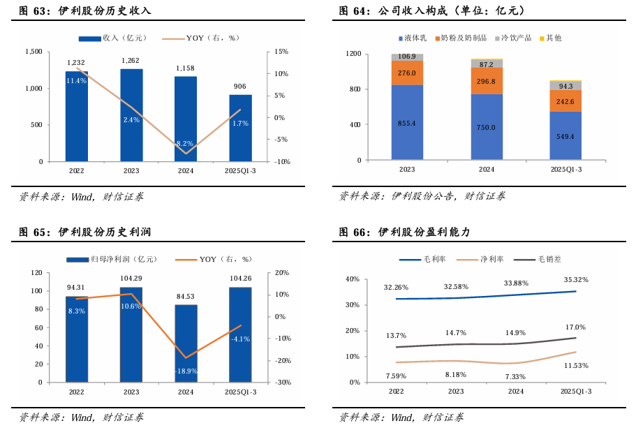 1)从各品类市场份额看,常温纯牛奶占比有所下滑。2025Q3,常温纯牛奶/冰淇淋/低温酸奶/常温酸奶/低温纯牛奶/其他奶制品的份额分别为36.9%/27.9%/15.0%/7.7%/4.4%/8.1%,占比分别同比-2.7/ 0.3/ 1.7/-0.8/ 1.2/ 0.4pp。