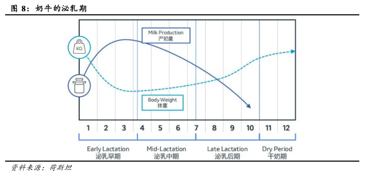 奶牛的泌乳周期分为4个阶段:泌乳早期,泌乳中期,泌乳后期和干奶期。泌乳早中晚每个周期120天左右。产奶量在泌乳早期达到高峰,一般而言在产后6-10周的时间,而后逐渐减少。