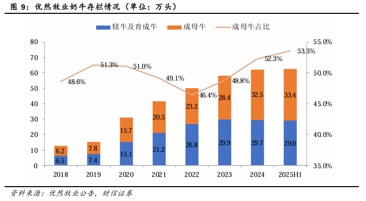 以行业龙头优然牧业为例,公司成母牛和后备牛(犊牛 育成牛)基本围绕50:50的比例波动。2023年以来,公司产能扩张的脚步放缓,奶牛存栏量维持稳步增长的水平,且后备牛占比持续下降。