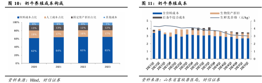 据山东省畜牧兽医局,可将奶牛养殖全成本分为成母牛公斤奶成本加上后备牛综合成本,其中成母牛公斤奶成本由全价料成本和生物资产折旧构成。对比当季的生鲜乳收购价格来看,2023年开始行业基本进入亏损阶段,且2024年以来亏损幅度有逐季扩大趋势。2024Q1-2025Q2各季度公斤奶亏损金额为0.01/0.23/0.38/0.38/0.42/0.41元。