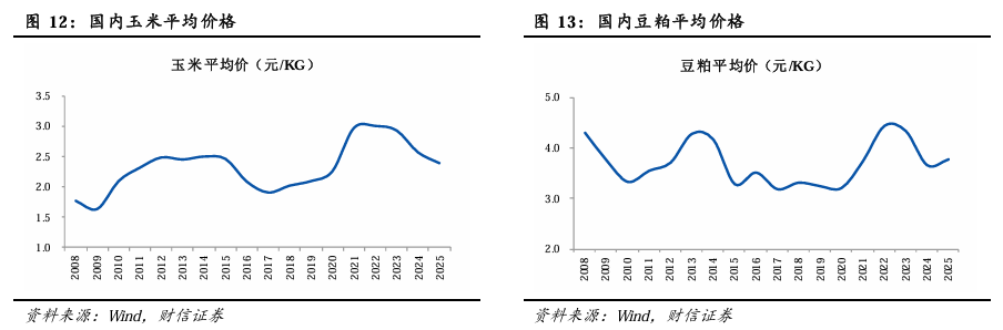 精饲料主要作用在于提升奶牛产奶量,改善乳脂率,弥补泌乳带来的营养消耗等。其原料通常包括玉米(提供能量)和豆粕(提供蛋白)等原材料,玉米和豆粕等原材料大多为大宗商品,价格有一定的波动。国内的玉米和豆粕的价格在2022年达到高点后持续下降,豆粕价格在2025年有所反弹。