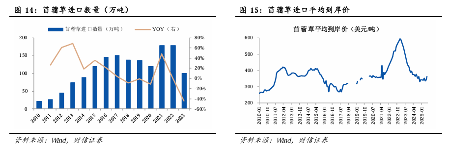 2010年以来,我国苜蓿草进口数量持续增加,2017年突破150万吨,随后有所减少,2021-2022年再次大幅增加至接近180万吨,2023年下滑至约100万吨。美国是主要进口国。在不考虑疫情带来的冲击影响下,苜蓿草进口的价格基本在300-400美元/吨区间范围波动。当前阶段,苜蓿草进口价格在中枢偏下水平位置。