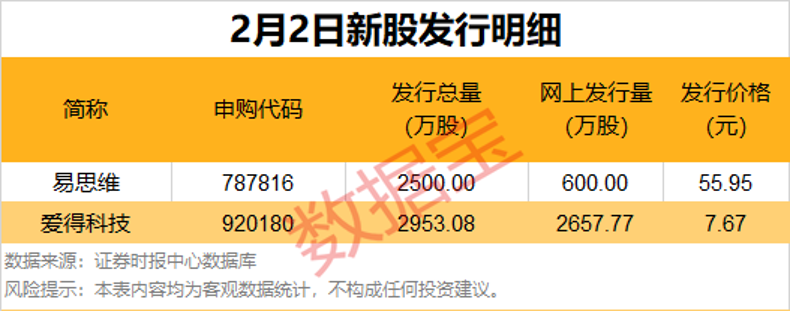 今日(2月2日)共有2只新股申购,分别为科创板的易思维,北交所的爱得科技。