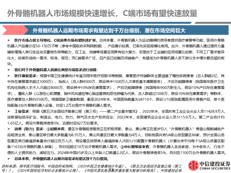 市场规模:未来几年将快速增长,C端市场有望加速放量。根据Markets and Markets等咨询公司数据,2025年全球外骨骼市场规模约39亿元人民币,预计未来6-8年内将保持快速增长;我国外骨骼机器人市场规模仍处于快速增长阶段,根据云湖咨询数据,我国外骨骼机器人市场规模从2018年的0.45亿元增长至2023年的10.6亿元,年复合增长率为88%,随着外骨骼机器人产品性能的提升和下游医疗需求的增长,市场规模快速扩容。我们判断,假设未来外骨骼机器人在医疗康复、工业、消费等领域得到普及应用,外骨骼机器人远期市场潜在需求有望达到千万台级别、市场规模可达百亿级,核心零部件市场增量空间也在百亿级,潜在空间巨大。