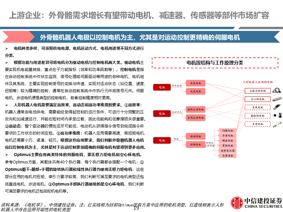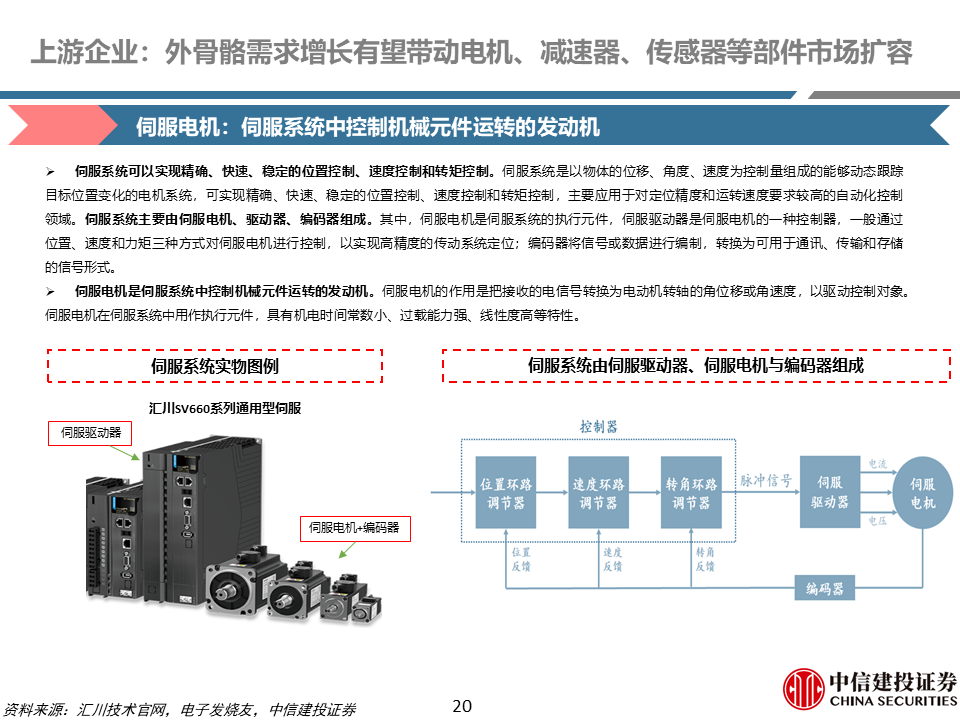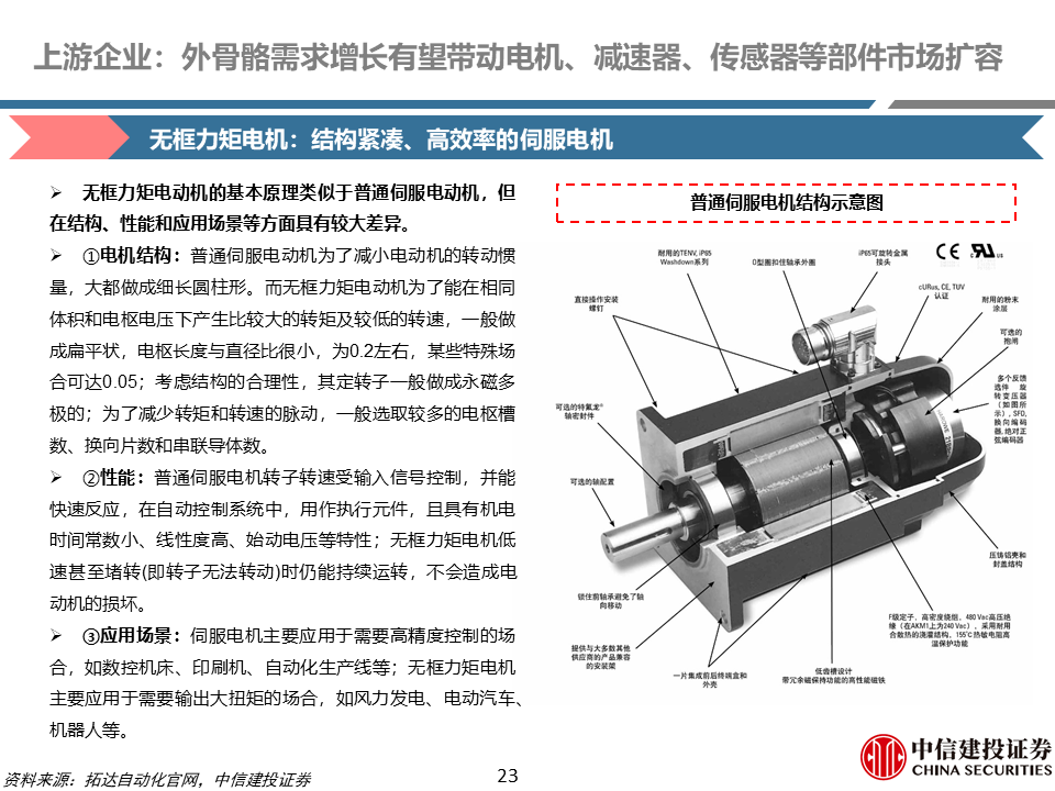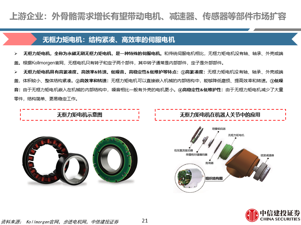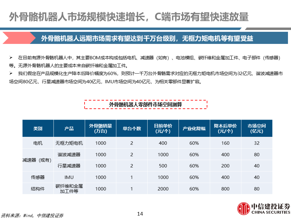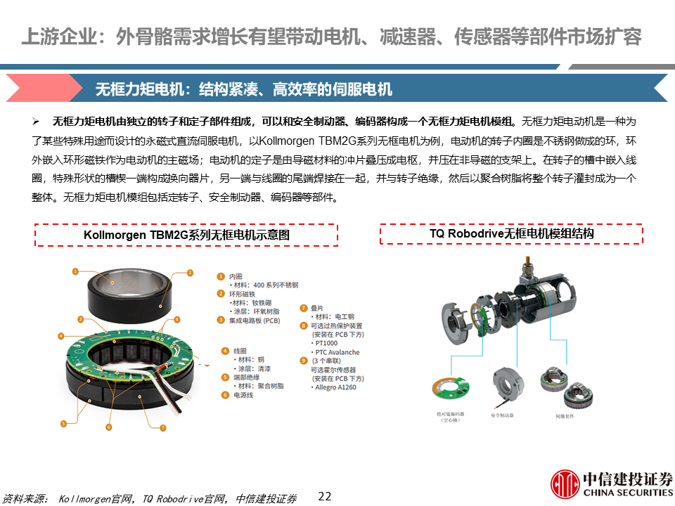 核心零部件:外骨骼机器人需求增长有望带动电机、减速器、姿态传感器等部件市场扩容。根据我们测算,一千万台外骨骼机器人,对应无框力矩电机、谐波/行星减速器、姿态传感器增量市场空间分别为为32亿元、80/40亿元、40亿元。无框力矩电机是外骨骼机器人的重要动力来源;减速器是外骨骼机器人重要传动部件;姿态传感器一般位于外骨骼机器人背部等关键位置,能够模拟人的平衡和空间定向功能。