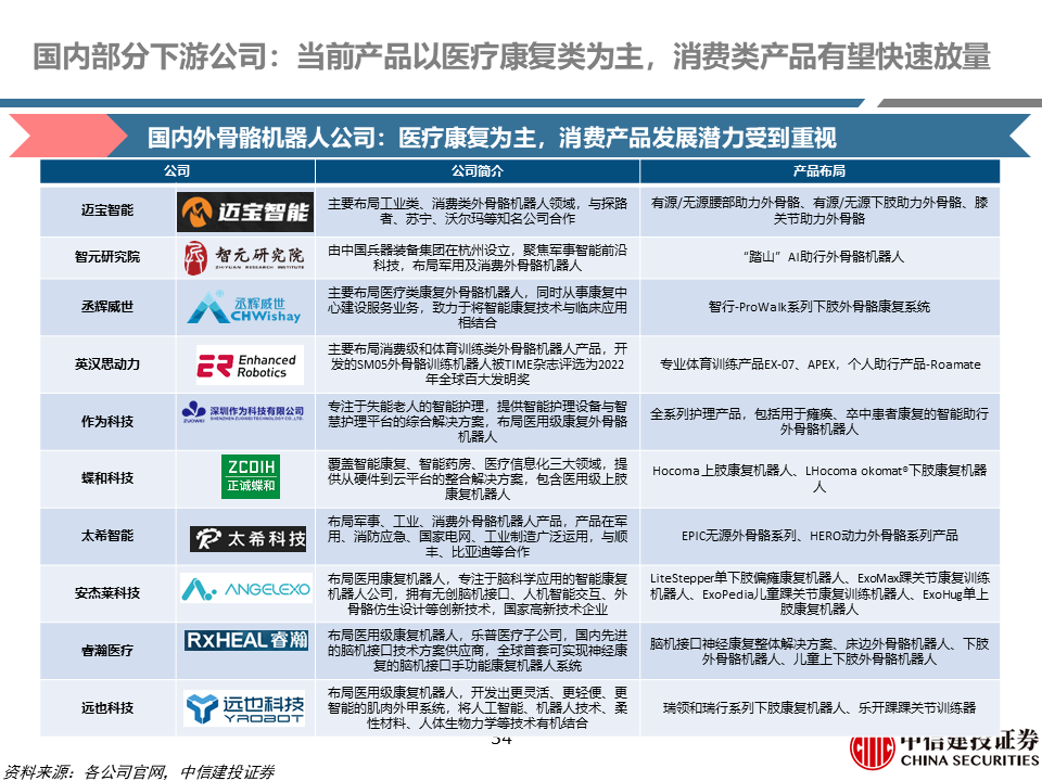 部分国产公司情况:目前的产品以医疗康复为主,逐步拓展消费类、工业类产品。