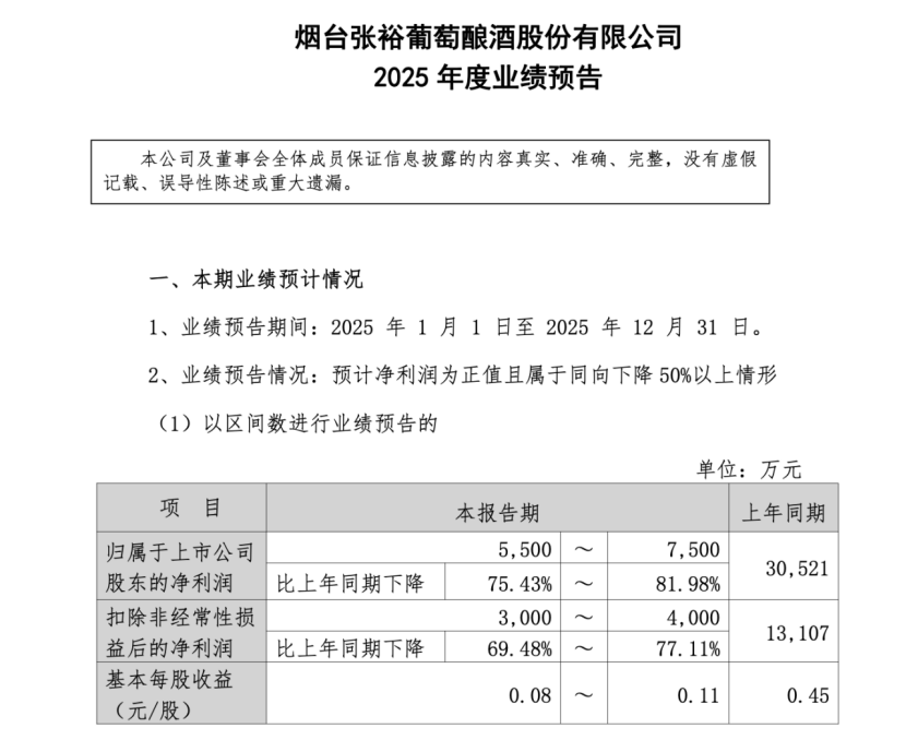 被称为“国产葡萄酒一哥”的张裕A(000869)近日发布业绩预告,预计2025年净利润将出现同比大幅下滑,降幅接近80%。