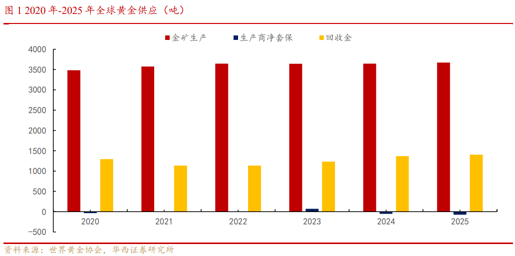 2025年黄金总供应量同比增长1%至5,002吨,创下自1970年以来的年度最高纪录,主要得益于创纪录的矿产产量和更高的回收供应量。初步估计显示2025年矿产金产量达到3,672吨的历史峰值。