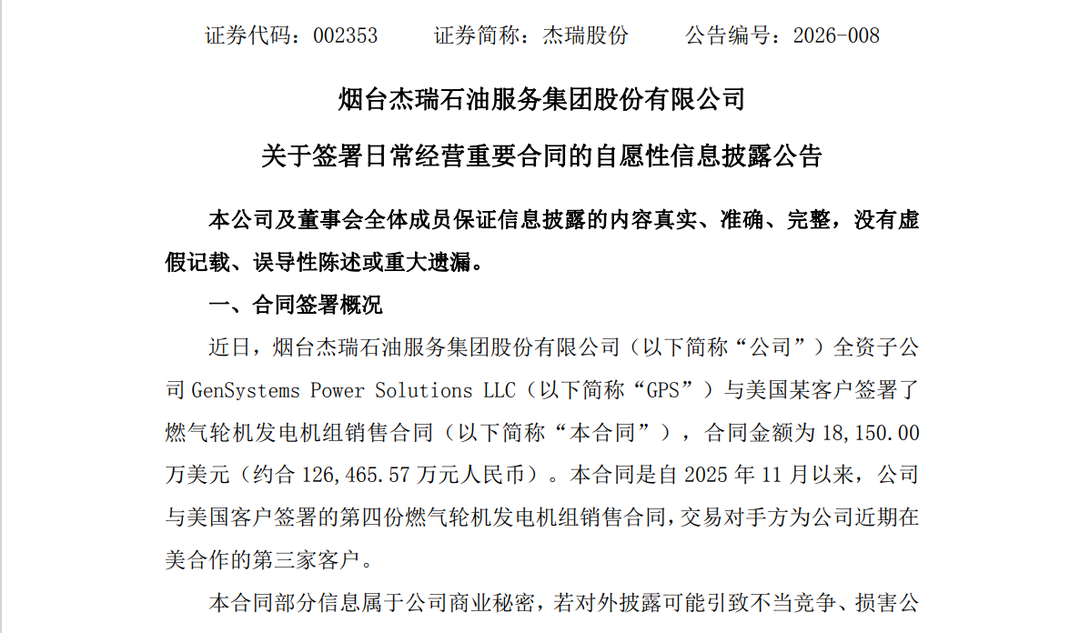 2月1日,杰瑞股份(002353.SZ)发布公告称,近日,公司全资子公司 GenSystems Power Solutions LLC(下称“GPS”)与美国某客户签署了燃气轮机发电机组销售合同(下称“本合同”),合同金额为1.82亿美元(约合 12.65亿元人民币)。该合同是自2025年11月以来,杰瑞股份与美国客户签署的第四份燃气轮机发电机组销售合同,交易对手方为其近期在美合作的第三家客户。合同交付期限为30个月,合同签署后,客户将支付一定比例预付款,其余款项按照合同约定进度支付,并于设备发货前付清全部款项。据该公告,本次销售的燃气轮机发电机组将应用于数据中心供电领域,采用高度集成化设计,可实现快速运输、现场拼装与灵活扩容,且搭配减排方案可降低工作过程中氮氧化物排放量,能够满足数据中心高负载、高可靠性以及低排放的用电场景。“本合同金额约占杰瑞股份2024年度经审计营业收入的9.47%,预计将对公司未来经营业绩产生积极影响。”杰瑞股份表示,合同的签署体现了北美市场对公司燃气轮机发电机组设备性能、交付能力以及综合服务实力的普遍认可和高度信任,标志着公司在北美市场的客户基础进一步扩大,客户群体更加多元化。杰瑞股份成立于1999年,注册地位于烟台市,2010年在深交所上市。公司从事的主要业务包括高端装备制造、油气工程及技术服务、油气田开发、新能源及再生循环等,正在从高端装备提供商、油气工程及技术服务提供商发展成为新能源绿色循环体系解决方案提供商。 经济导报记者注意到,杰瑞股份受到了较多机构的关注。2026年以来,已有银华基金、华泰证券、富国基金、广发证券、中再资产、中信证券、太平基金等多家机构对其进行调研。在1月30日的调研活动中,杰瑞股份表示,公司深耕海外市场多年,此前已有燃气轮机发电机组设备在北美市场实现销售及租赁的成功案例,得到海外客户的反复验证与认可,在北美电力业务领域建立了良好的品牌口碑。未来,公司将在数据中心、工业能源和新型电力系统三大赛道持续深耕。二级市场上,2026年以来,杰瑞股份股价整体呈上涨态势。1月29日,该股盘中最高触及95.71元,较1月5日盘中最低点70.30元上涨36.15%。2月2日,公司股价开盘上涨,截至当日收盘,上涨0.43%,报收于88.63元。业绩方面,杰瑞股份2025年三季报显示,公司2025年前三季度营业收入为104.20亿元,同比增长29.49%;归母净利润为18.08亿元,同比增长13.11%。对于前三季度营收和净利润均实现两位数增长,公告称,主要得益于公司主业增长、海外拓展、订单充足等多方面因素。值得一提的是,近日,杰瑞股份还与惠生控股(集团)有限公司(下称“惠生集团”)在上海签署了战略合作协议,双方将依托各自在能源工程与高端装备领域的能力积累,重点围绕海工装备国产化、陆地油气工程协同及联合开拓市场等方向,探索潜在合作机会,推动优势互补,形成更具韧性与效率的协作模式。惠生集团成立于1997年,位于上海,是一家立足于能源工程服务领域,横跨工程服务、海洋工程两大产业体系的多元化集团公司。