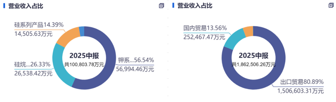 三孚的营收构成像是设计精巧的化学反应图册。2025中报显示,其钾系列产品(包含硫酸钾和氢氧化钾)占营收56.54%,硅烷偶联剂以26.33%稳居第二,剩下的14.39%则来自高纯四氯化硅、三氯氢硅、气相等无机硅材料。虽然钾肥仍是最大头,但公司从2022年起便把硅烷偶联剂单独列示,目前作为第二主业的战略地位不可动摇;与之相对的是曾风光一时的硅系列产品,其占比从2022年的50% 下滑至不足15%,反映出无机硅材料市场的退潮周期来袭。