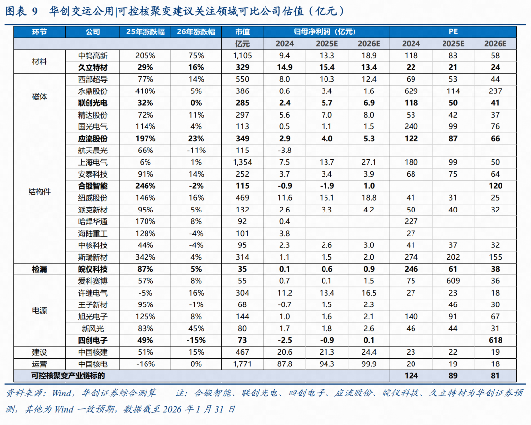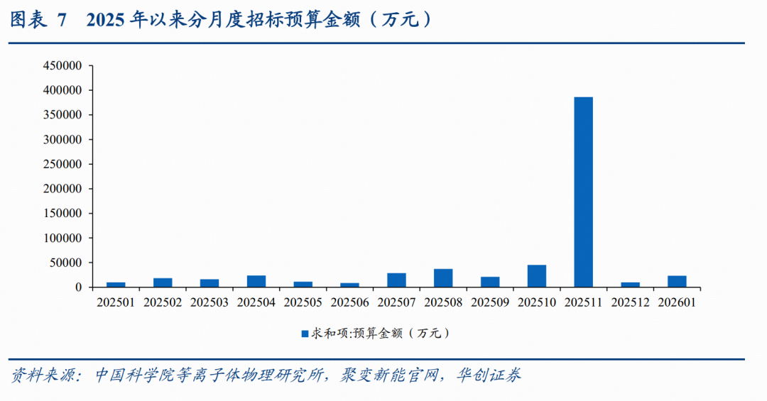 根据我们统计的招标数据,2025年11月,中科院合肥等离子体物理研究所及聚变新能安徽的招标项目显著放量,仅11月招标金额就达到39亿量级,而2025Q1、2025Q2、2025Q3的招标金额分别仅为4.48、4.40、8.72亿元,11月单月招标金额已显著超过前三季度招标金额的总和。2026年1月,招标总额约为2.33亿元,同比增长较为显著。