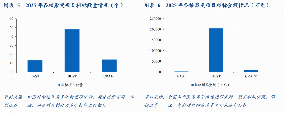 2025年初以来,根据我们统计的招标数据,2025年1月1日至2026年1月31日,BEST项目招标数量达到48个,招标预算金额达到20.48亿元,同期EAST、CRAFT项目的招标数据量仅为13、14个,招标预算金额分别为0.22、0.82亿元。其中,EAST项目多为升级维护,而BEST则涉及多个关键部件(磁体线圈、偏滤器、包层系统及第一壁)的招标,高价值量订单密集落地,表明行业或已逐步从密集招标步入密集中标的阶段,资本开支扩张逻辑持续验证。