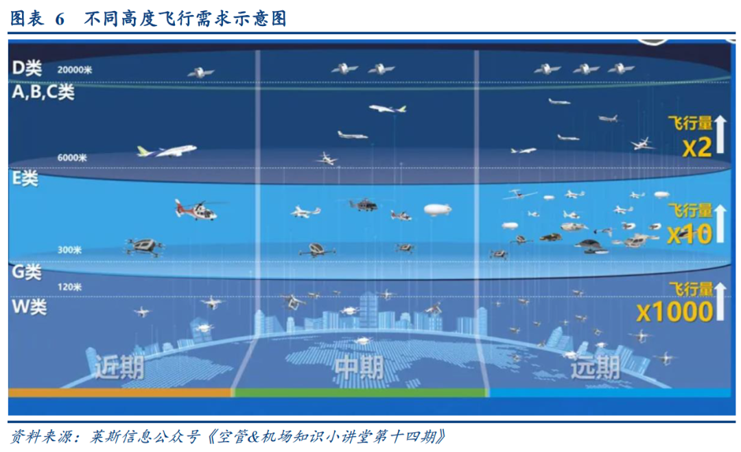 低空飞行存在起降场/点多且分散、飞行场景广且需求规模大,飞行环境复杂且多变三重因素。中远期看低空飞行的量级是高空飞行的数倍到数百倍,飞行空域越低,规模越大。