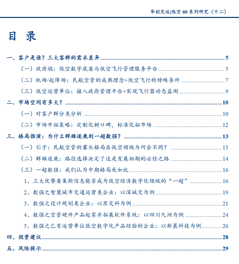 本篇报告作为华创交运低空60系列深度(12),我们聚焦在低空经济数字化领域,从三大客户群体需求分析出发,模拟测算市场空间并对中期格局进行推演,我们认为将从群雄逐鹿到一超数强: