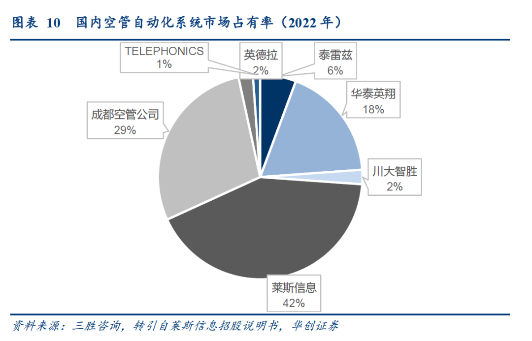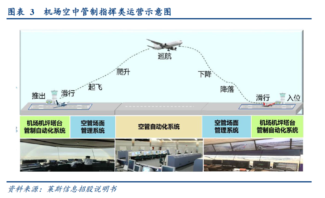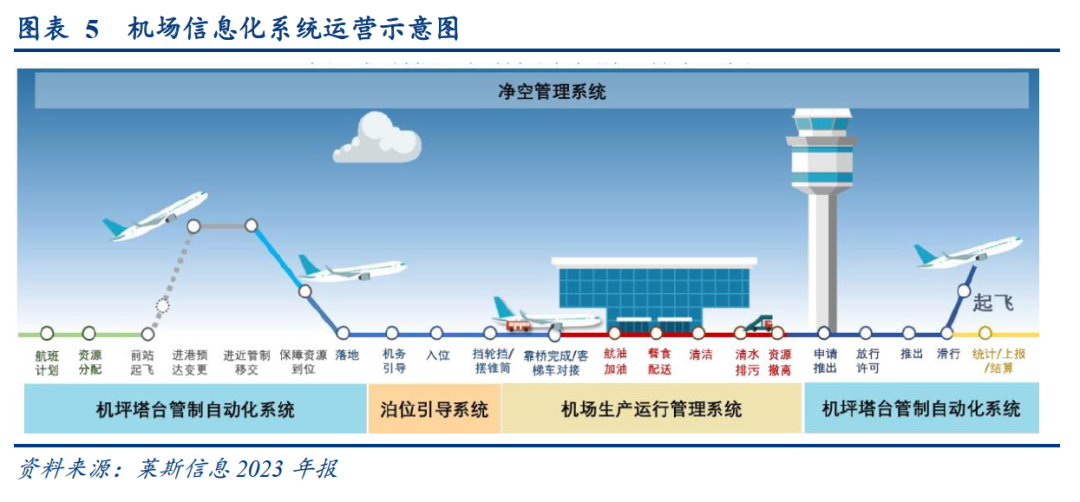 民航空管的核心是空管系统,完整的描述是通信、导航、监视与空中交通管理系统。根据莱斯信息2024年中报介绍,机场信息化领域是面向机场飞行区和航站区,从空中态势感知到地面监测服务,从视频感知到数字化感知,为机场提供全面、融合、精准的信息服务,实现空地一体化态势监控,构建从前站起飞到落地、地面保障、本场起飞航班运行全流程管控体系,提升机场的运营效率、服务质量和管理水平。