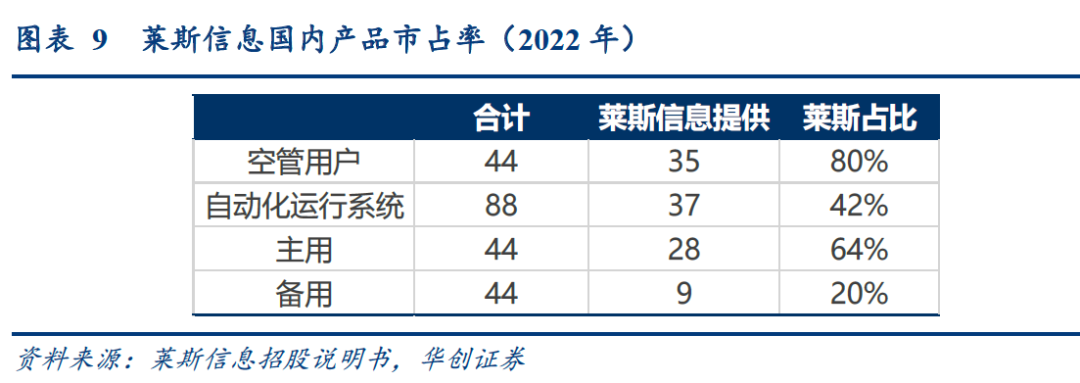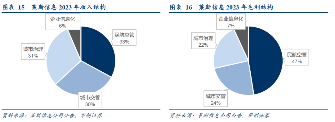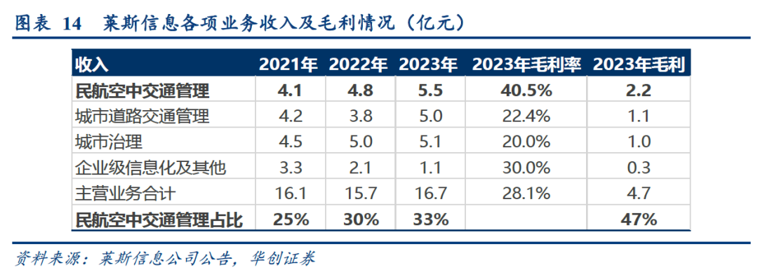 莱斯信息2023年收入16.8亿,主营业务收入16.7亿,其中民航空中交通管理、城市道理交通管理、城市治理、企业级信息化等分别实现收入5.5、5、5.1及1.1亿,空管业务占主营业务收入比重33%。