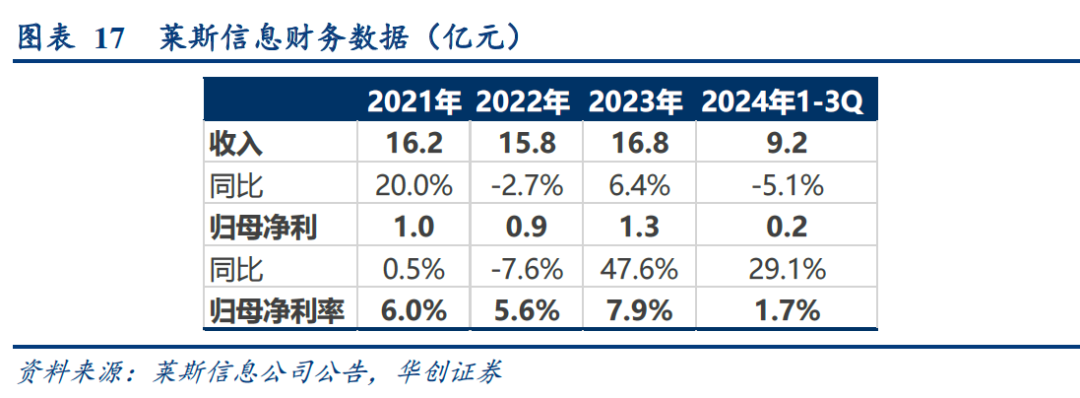 2023年莱斯信息收入16.8亿,归母净利1.3亿,净利率7.9%,24年前三季度收入9.2亿,同比下降5.1%,归母净利0.2亿,同比增长29.1%,行业商业模式使得四季度通常是收入、利润确认高峰季度。