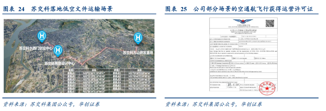 2024年9月19日,公司公众号介绍,目前已完成苏交科南京设计中心、水西门创业中心及方山研发基地三地低空通航飞行空域的审批,并已经获得运营许可证,经营范围包括载货、培训及其他。运输无人机通过自研的腾云低空飞行监管服务平台控制,实现固定航线的定期文件运输和其他派发任务,率先开展文件传输应用场景,积累低空飞行和服务经验。