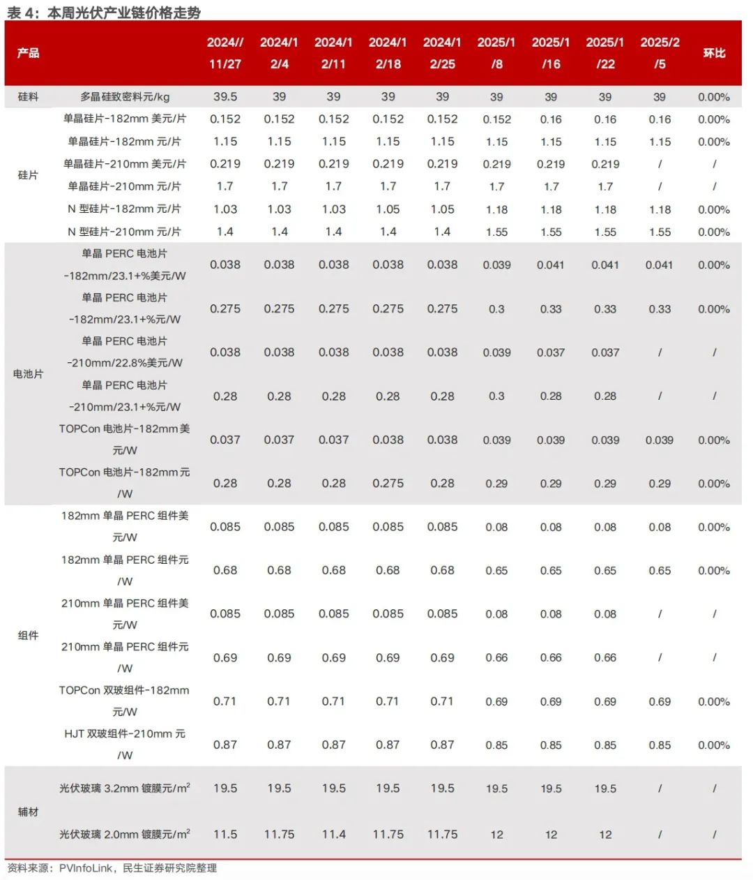 组件:春节过后,本周市场相对平稳,走单较少,部分厂家仍在放假。现货市场与集中式项目活动平稳,订单商谈尚未达成一致。本周组件价格执行交付价在每瓦0.68-0.70元人民币,低价区间(0.6-0.65元)逐渐收窄。182 PERC双玻组件价格在每瓦0.6-0.68元,210 PERC组件价格因春节后生产结束,二月起取消现货价格。HJT组件价格在每瓦0.69-0.85元,主要交付前期订单,大项目价格偏向中低价位。BC方面,N-TBC组件价格在每瓦0.68-0.79元之间。需要关注政策变化,组件厂商可能面临质量要求的相关规范出台。海外市场价格稳定,欧洲市场随着低价订单交付结束,预计价格略有上涨,但仍待终端接受度决定。TOPCon组件在亚太市场价格约0.085-0.09美元,印度市场本地和中国电池片价格差距不大,大宗成交价为0.14-0.15美元。澳洲价格在0.09-0.10美元,欧洲现货市场价格回稳,预计涨至0.1欧元。拉美市场价格在0.085-0.09美元区间,巴西价格混乱。美国市场受政策影响,二月项目需求疲弱,新交付TOPCon组件价格为0.2-0.27美元,PERC与TOPCon价差0.01-0.02美元。近期订单报价下调,预计一季度价格会进一步下探。