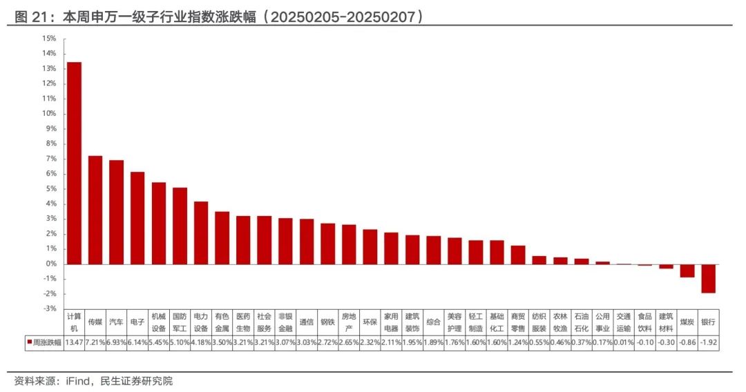 电力设备与新能源板块:本周上涨4.18%,涨跌幅排名第7,强于上证指数。本周工控自动化涨幅最大,风力发电指数涨幅最小。工控自动化上涨7.99%,太阳能指数上涨7.78%,新能源汽车指数上涨6.38%,储能指数上涨5.32%,核电指数上涨2.91%,锂电池指数上涨2.59%,风力发电指数上涨2.23%。