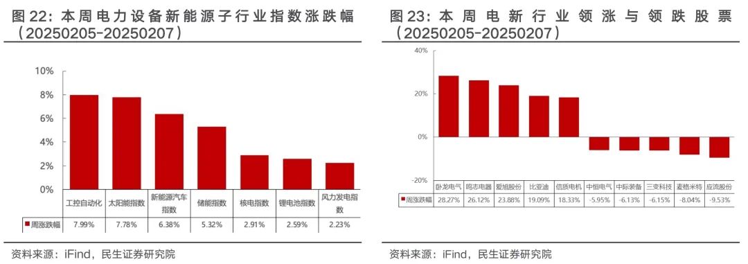 板块子行业:本周工控自动化涨幅最大,风力发电指数涨幅最小。工控自动化上涨7.99%,太阳能指数上涨7.78%,新能源汽车指数上涨6.38%,储能指数上涨5.32%,核电指数上涨2.91%,锂电池指数上涨2.59%,风力发电指数上涨2.23%。