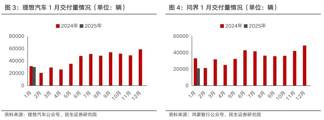 问界:1月交付20,926辆,同/环比分别为-30.7%/-36.5%,其中问界 M5 销量显著下降,导致整体交付量大幅减少。