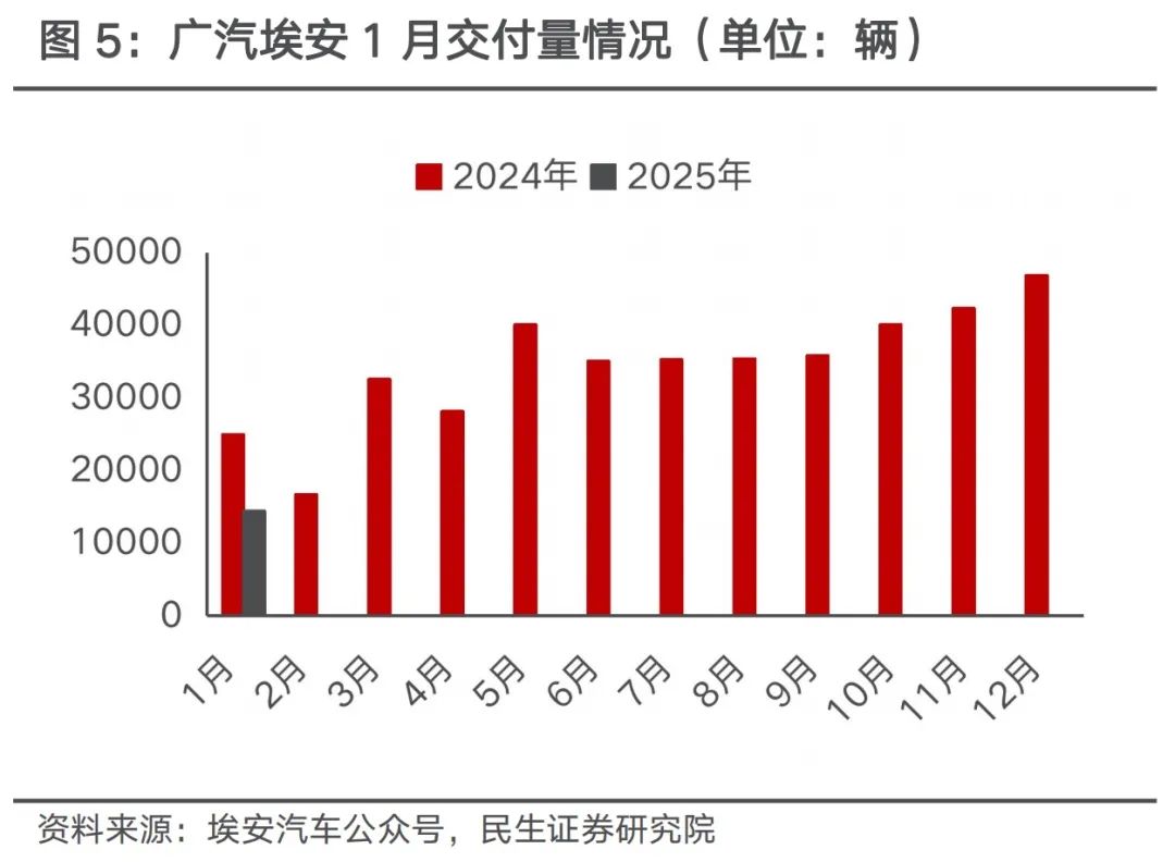 广汽埃安:1月交付14,393辆,同/环比分别为-42.3%/-69.3%,出现大幅下滑。