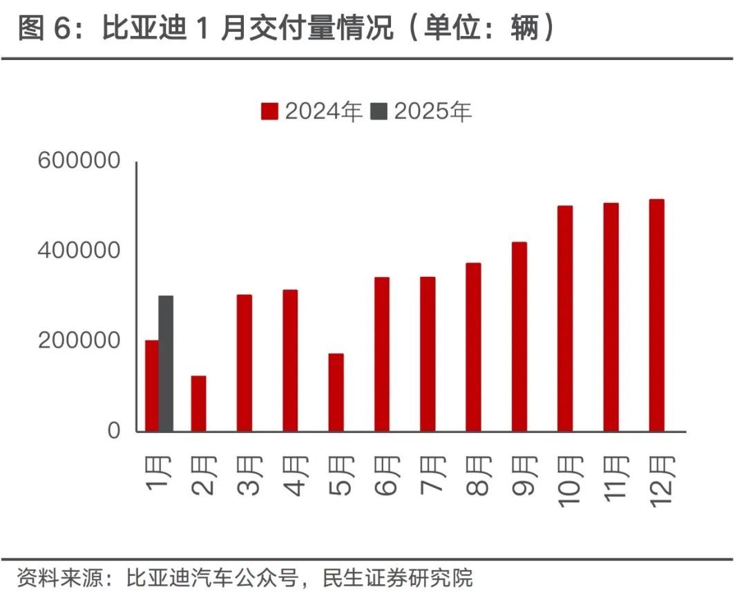 比亚迪:1月单月交付300,538辆,同/环比分别为49.2%/-41.6%,继续保持强势。