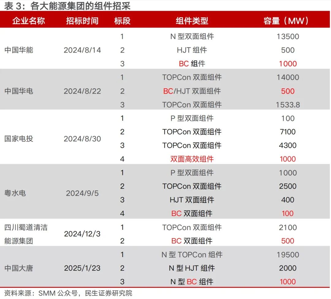 央企招标青睐BC产品。根据大唐集团25-26年度光伏组件框架采购的招标公告,分别为TOPCon、HJT和BC,对应的预估采购总量分别为19.5GW、2GW、1GW。与24年中国大唐16GW的组件集采相比,本次集采总规模更大、有效期更长,取消PERC产品、新增高效BC产品。根据SMM统计,2024年以来五大发电集团开展的组件集采中均设置BC标段,或将意味着市场对BC组件的接受认可程度有所提升。