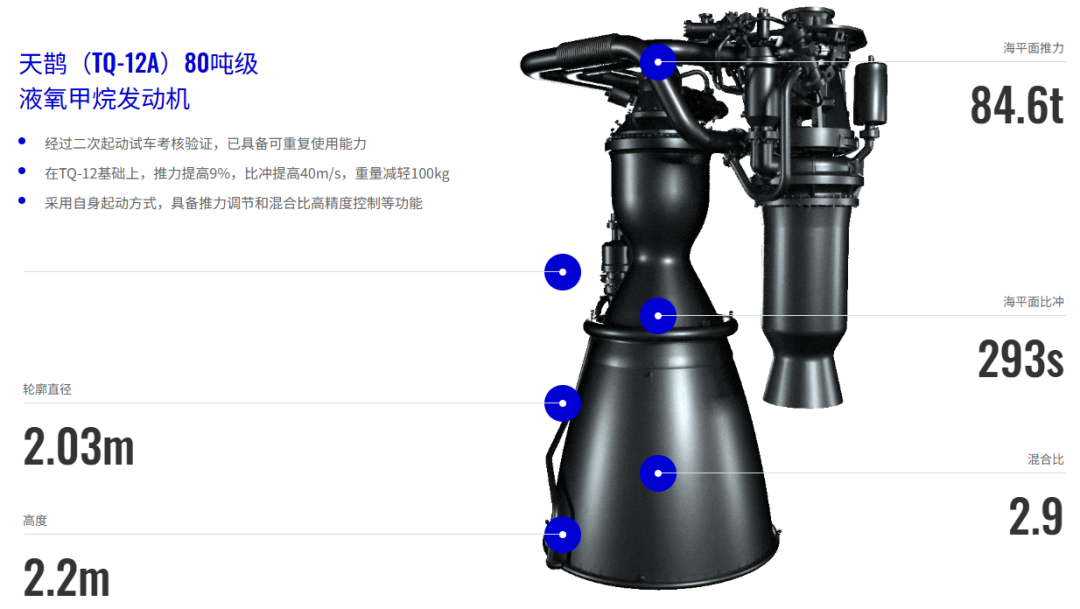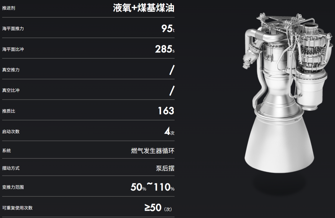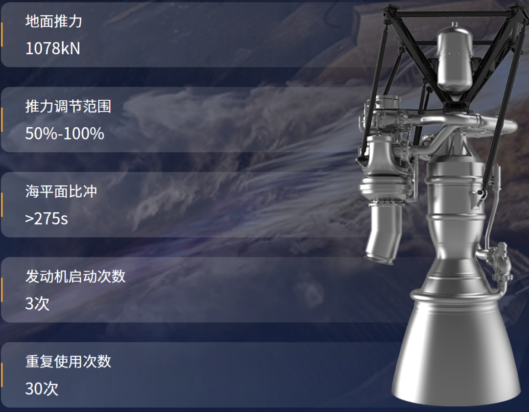 其推重比大于150,地面推力1240kN(约130吨),支持多次起动,满足火箭回收复用需求,可实现太阳同步轨道18吨的运载能力,主要面向大规模商业遥感星座部署、空间站建设等高运力需求任务。