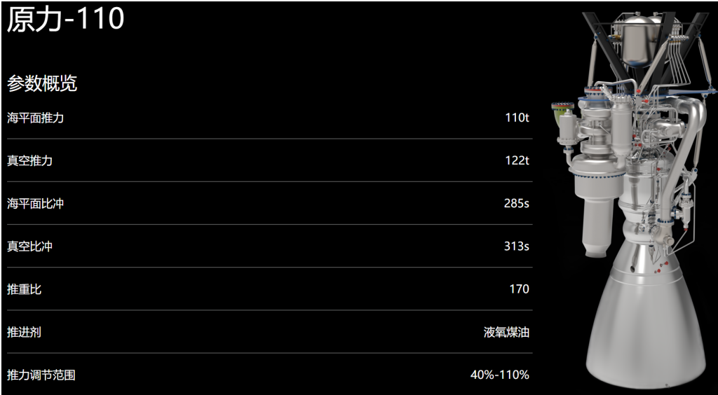 自研液氧煤油推进剂, 燃气发生器循环技术路线,性能与高可靠性、高效研发并进,推重比170,原力-110海平面推力110吨,具备40%~110%深度变推能力,设计目标复用20次以上。将用于东方空间的“引力二号”可重复使用中大型液体运载火箭。大量采用3D打印技术,降低发动机生产成本。
