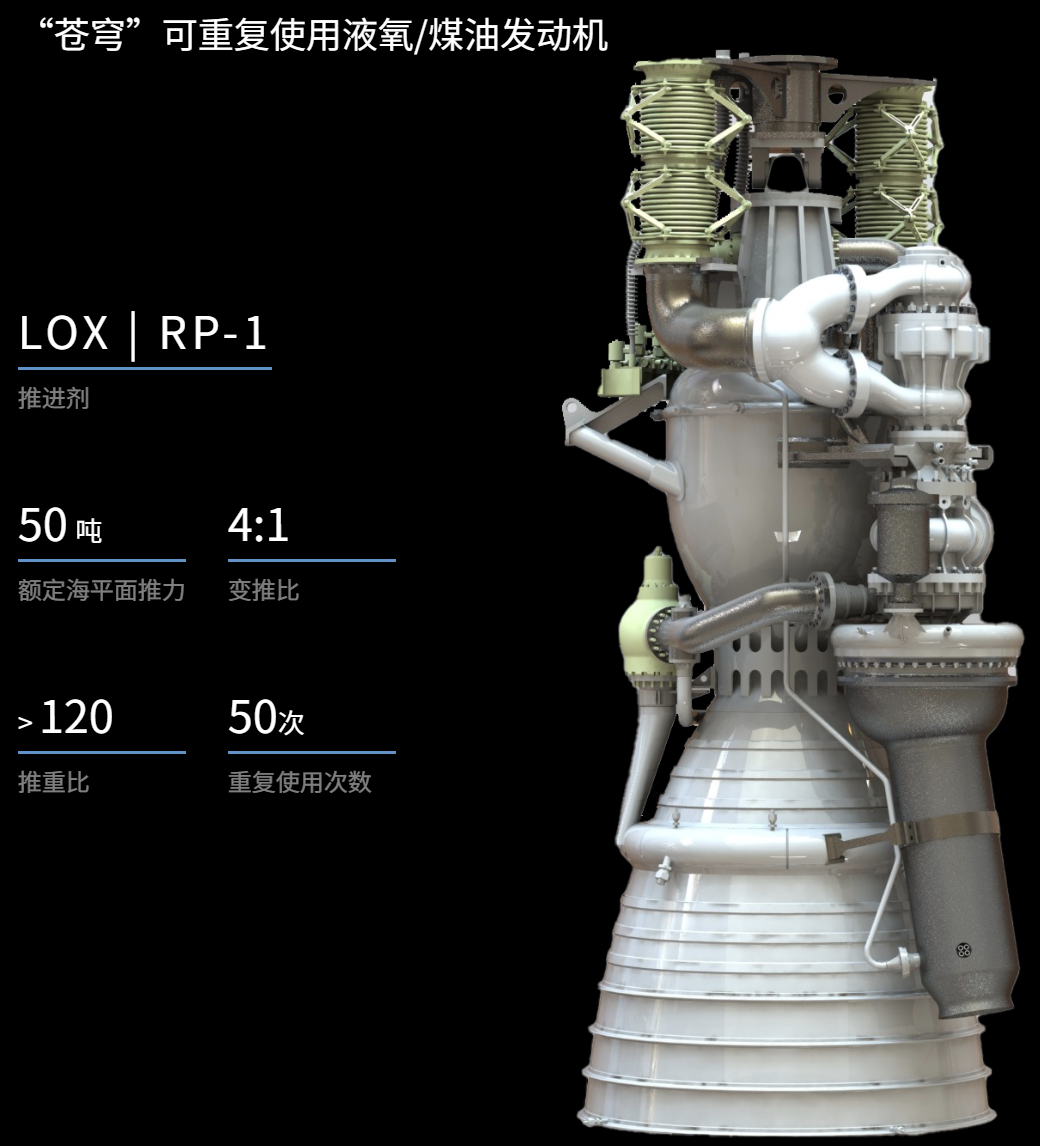 苍穹-50 ,是星河动力采用可重复使用液氧/煤油发动机。全面对标Space X ,打造中国第一款“梅林”,体重比大于120,采用多回流涡异形燃气发生器,多功能组合阀一体化设计和3D打印。
