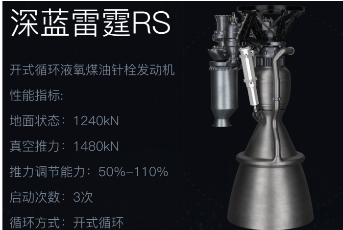 雷霆RS发动机是深蓝航天“星云二号”大型可回收运载火箭一子级的动力核心,单台“星云二号”火箭一子级配备11台雷霆百吨级液氧煤油RS发动机。