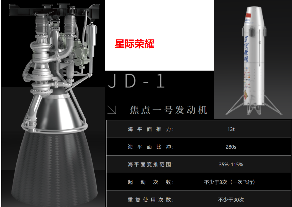焦点一号(JD-1)是星际荣耀自主研发的15吨级可重复使用液氧甲烷发动机,为星际荣耀的“双曲线二号Y”可重复使用液体验证火箭提供动力,支持火箭垂直起降(VTOL)和重复回收试验,为后续中大型可重复使用火箭的研发积累技术经验。