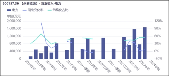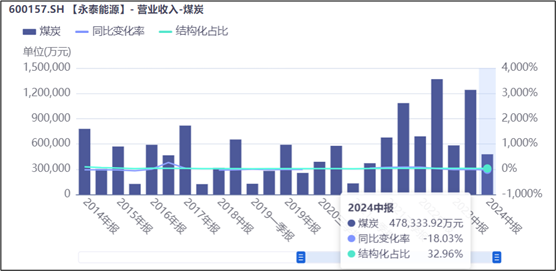 从业务来看,永泰主营紧密相连的两块:卖煤和卖电。其中,“卖煤”很好理解,煤矿开采对外销售;“卖电”则是利用自身开采的煤进行燃煤发电,对外销售。从收入结构来看,2024年上半年,煤炭业务创收占比为32.96%,电力及热力业务创收约60.67%,占比虽有差异,但均是重中之重。