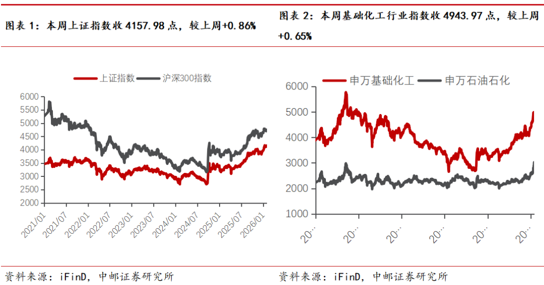 整体看,截至本周五(1月30日),上证综指收于4157.98点,较上周五的4122.58点上涨0.86%;沪深300指数报4753.87点,较上周五上涨0.64%;申万化工行业指数报4943.97点,较上周五上涨0.65%;本周化工行业指数跑赢沪深300指数0.01%。