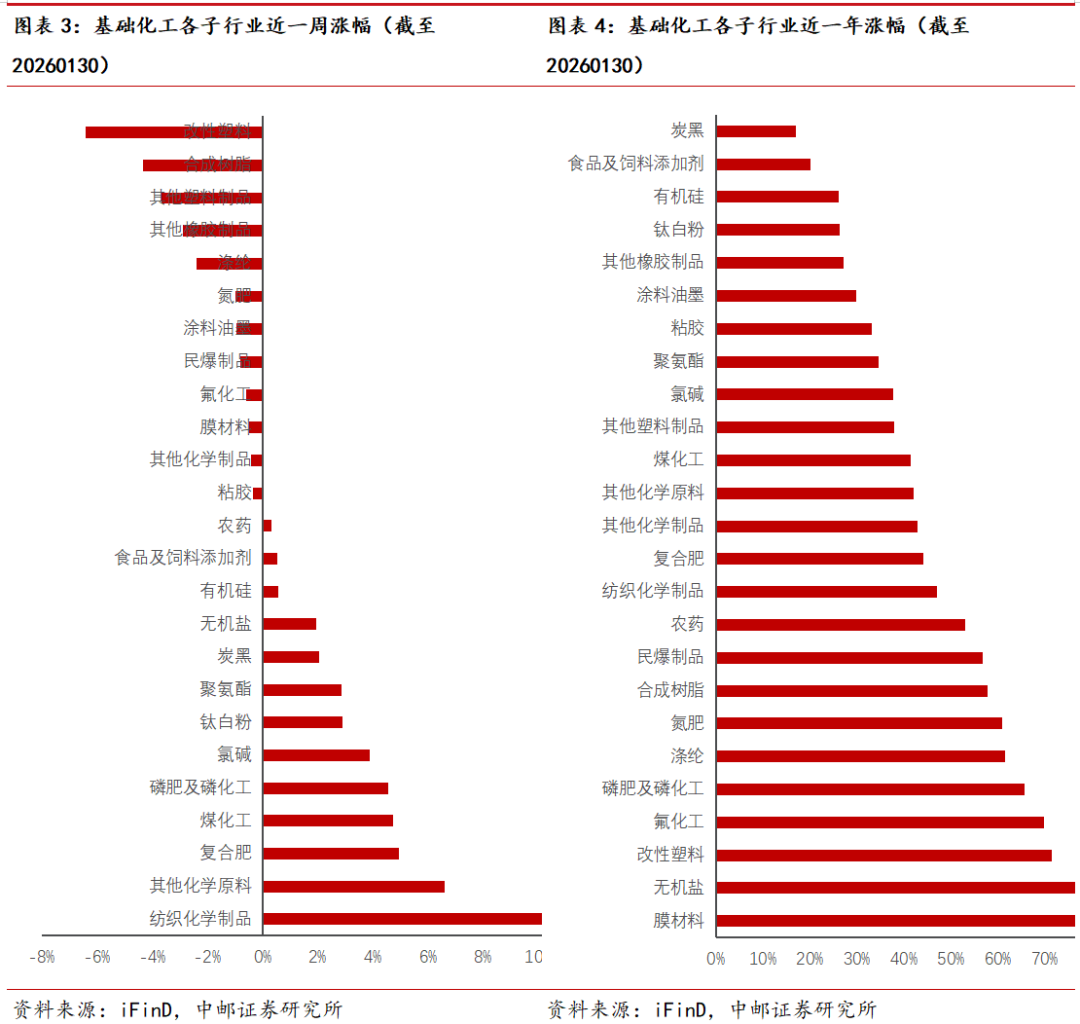 细分子行业看,截至本周五(1月30日),申万化工三级分类中13个子行业收涨,12个子行业收跌。其中,纺织化学制品、其他化学原料、复合肥、煤化工、磷肥及磷化工行业领涨、周涨幅分别为13.89%、6.58%、4.94%、4.72%、4.56%;改性塑料、合成树脂、其他塑料制品行业走跌,周跌幅分别为-6.44%、-4.36%、-3.67%。