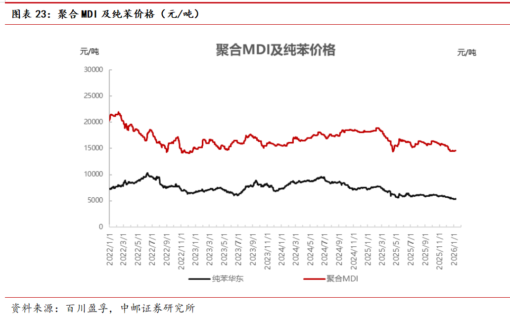 (1)市场走势:本期聚合MDI市场价格微幅波动。纯苯价格上调3.78%,苯胺价格持稳,硬泡聚醚价格持稳。截至1月29日收盘,聚合MDI国内市场上海货源价格在13800-13900元/吨。