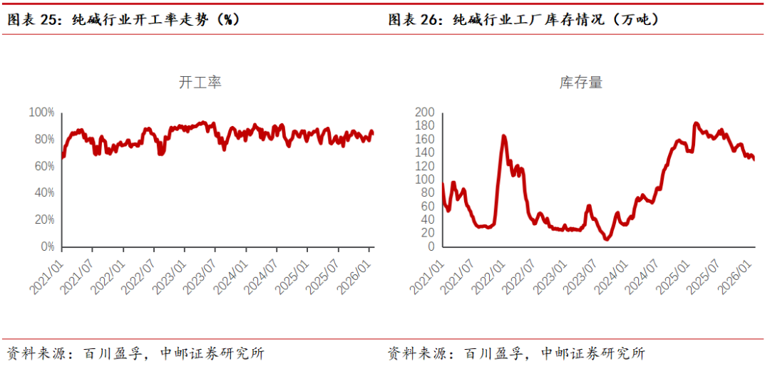 供应方面:截止到2026年第4周,据百川盈孚统计,中国国内纯碱有效产能共计4335万吨(共22家联碱工厂,运行产能共计2010万吨;11家氨碱工厂,运行产能共计1435万吨;以及4家天然碱工厂,产能共计890万吨)。四川和邦,2025年5月22日老线30万吨装置停车检修,暂未恢复;杭州龙山,纯碱装置降负运行,恢复周期暂未确定;冷水江金富源,2025年6月26日起装置停车检修,2025年1月22日点火,现品质恢复中;陕西兴化,2025年6月28日起,纯碱装置停车检修,恢复周期待定;安徽德邦,2025年7月8日起纯碱装置停车检修,暂未恢复;重庆和友,2025年11月10日起纯碱装置停车检修;中盐昆山,2025年12月16日起纯碱装置降负运行,暂未恢复;江苏井神,2026年1月19日纯碱装置减量检修,暂未恢复;天津渤化,2026年1月25日起纯碱装置降负,现逐步恢复中。截至目前,本周整体纯碱行业开工率为84.12%,较上周相比下降0.45%。