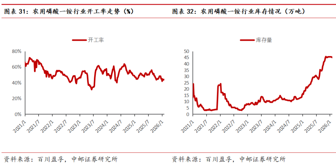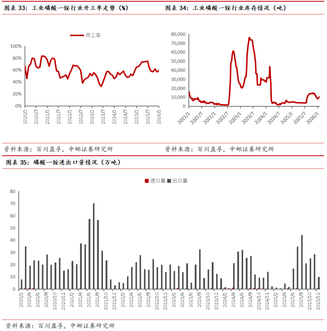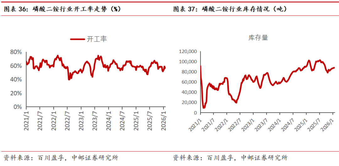 工业磷酸一铵:工业级磷铵市场交投按需,价格僵持维稳。截至本周四(1月29日),国内73%工业级磷酸一铵市场均价为6507元/吨,较上周同期价格(6496元/吨)上周11元/吨,涨幅为0.17%。供应方面:据百川盈孚不完全统计,预计本周工业级磷铵(2026.1.23-2026.1.29)期间,周度产量约6.82万吨,较上周(6.60万吨)产量增加。工业级磷铵行业开工率至61.92%,环比上周四(59.87%)开工率上涨。其中,华中、西南地区开工分别为:72.75%、51.05%。需求方面:本周下游市场需求整体较为平淡,采购积极性不高。从近期情况看,需求端以刚需进货为主,整体表现依然偏弱。受年底临近影响,尽管部分磷酸铁企业存在补库需求,但询价时普遍抱有压价心态,市场成交氛围一般。下游阻燃剂及高端水溶肥等行业也多以刚性需求为主导,按需采购,新增订单释放有限,整体市场交投氛围相对清淡,缺乏明显放量支撑。