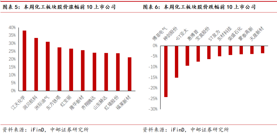 截至本周五(1月30日),化工板块的462只个股中,有415只周度上涨(占比90%),有44只周度下跌(占比10%)。7日涨幅前十名的个股分别是:江天化学、润贝航科、洲际油气、东方铁塔、红宝丽、隆华新材、齐翔腾达、山东赫达、红墙股份、福莱新材;7日跌幅前十名的个股分别是:博菲电气、神剑股份、*ST亚太、惠博普、宝莫股份、ST泉为、东材科技、荣盛石化、蒙泰高新、天晟新材。