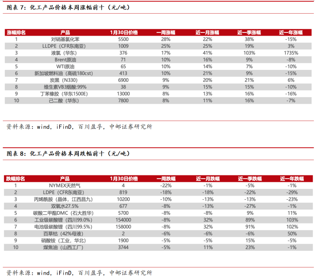 截至本周五(1月30日),我们重点跟踪的380种化工产品中,有132种产品价格较上周上涨,有56种下跌。7日涨幅前十名的产品是:对硝基氯化苯、LLDPE(CFR东南亚)、液氯(华东)、Brent原油、WTI原油、新加坡燃料油(高硫180cst)、炭黑(N330)、维生素VB3烟酸:99%、丁苯橡胶(华东1500E)、己二酸(华东);7日跌幅前十名的产品是:NYMEX天然气、LDPE(CFR东南亚)、丙烯酰胺(晶体,江西昌九)、双氧水27.5%、碳酸二甲酯DMC(石大胜华)、工业级碳酸锂(四川99.0%)、电池级碳酸锂(四川99.5%)、百草枯(42%母液)、硝酸铵(工业,华北)、煤焦油(山西工厂)。