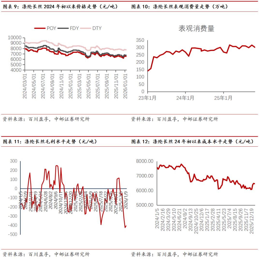 需求方面:截至1月29日江浙地区化纤织造综合开机率为43.23%,随着年末逐渐临近,终端需求减弱叠加工人返乡增多,下游织机开机率下滑速度加快,此外由于长丝价格持续上涨,成本高位导致用户备货意愿偏低,仅少量工厂在成本持续拉涨担忧情绪中选择少量备货操作,整体原丝采购氛围冷清。在下游成品坯布市场方面,前期积累的库存量较大,叠加当前需求疲软的状况,尽管原丝价格不断上扬,坯布价格却未能实现同步跟涨,产业链价格传导不畅,但考虑春节期间企业资金需求较大,织企多急于通过出货来回笼资金,与此同时,中间布商备货情绪受原丝拉涨情绪带动,共同催化场内坯布库存水平有所下降,然而鉴于原丝采购成本高压,下游用户核算利润空间亏损严重,对于原丝的采购备货积极性受到明显抑制,据反馈,部分厂商存在推迟春节后重启时间的规划,需求面疲态难掩。库存方面:本周前期下游部分用户适量采购,长丝产销局部回暖,库存水平较上周下降,截止至本周四,POY库存在12-15天附近,FDY库存在14-16天附近,DTY库存在18-21天附近。成本方面:截至本周四,涤纶长丝平均聚合成本在5791.03元/吨,较上周平均成本上涨270.35元/吨。利润方面:截至本周四,涤丝POY150/48平均加工差为1078.98元/吨;FDY150/96平均加工差为1328.98元/吨;DTY150/48低弹平均加工差为1190元/吨。根据行业平均理论加工费核算,即涤纶POY150D平均盈利水平为-21.03元/吨,较上周平均毛利下降110.36元/吨;涤纶FDY150D平均盈利水平为-221.03元/吨,较上周平均毛利下降100.35元/吨;涤纶DTY150D平均盈利水平为-10元/吨,较上周平均毛利上涨50元/吨。
