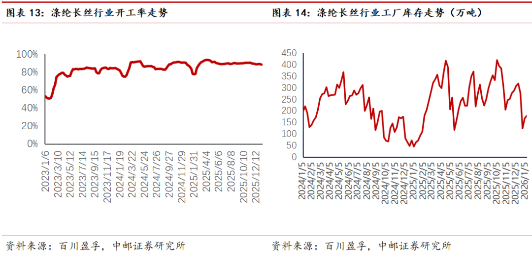 开工率历史高位 库存偏低,粘胶行业具备涨价基础。目前粘胶短纤中小工厂仍在陆续签单,大厂已经开始限制签单,除了少量刚需订单可谈外,原则上已经完成签单的客户,不再额外扩大订单。生产角度,根据百川盈孚数据,粘胶短纤行业开工率自2025年6月后持续走高,9月到11月开工率均超过9成,截至12月底,行业月度开工率均高于历年同期水平。库存角度,临近春节,下游开始年前备货,下游走货的支撑下库存显著下降。根据百川盈孚的数据,截至2026年1月30日,行业工厂总库存10.0万吨,环比前一周下降了24.53%,按照国内年表需410万吨量级推算库存天数约为9天,处于相对低位,行业具备涨价条件。