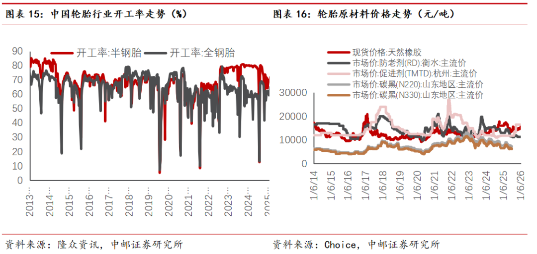 (6)欧美轮胎价格:2025年10月,美国从东南亚进口轮胎的单价为48.43美元/条,同比-6.27%,环比 2.61%,从其他地方进口的轮胎单价为89.03美元/条,同比-4.39%,环比-2.35%。2025年11月,欧盟进口轮胎价格为3804欧元/吨,同比-2.90%,环比 1.17%,其中从中国和泰国进口轮胎的价格分别为3193、2661欧元/吨,同比分别-4.85%,-9.24%,环比分别 5.14%、 58.93%。