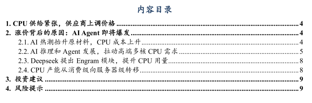 投资建议:AI Agent落地速度正逐渐加速,其带来的沙箱创建、负载卸载等需求有望大幅拉动CPU的需求。但同时,全球算力供应链产能紧张,多个环节涨价,使得CPU制造成本增加。两方面影响下,我们认为CPU产业有望迎来大周期。